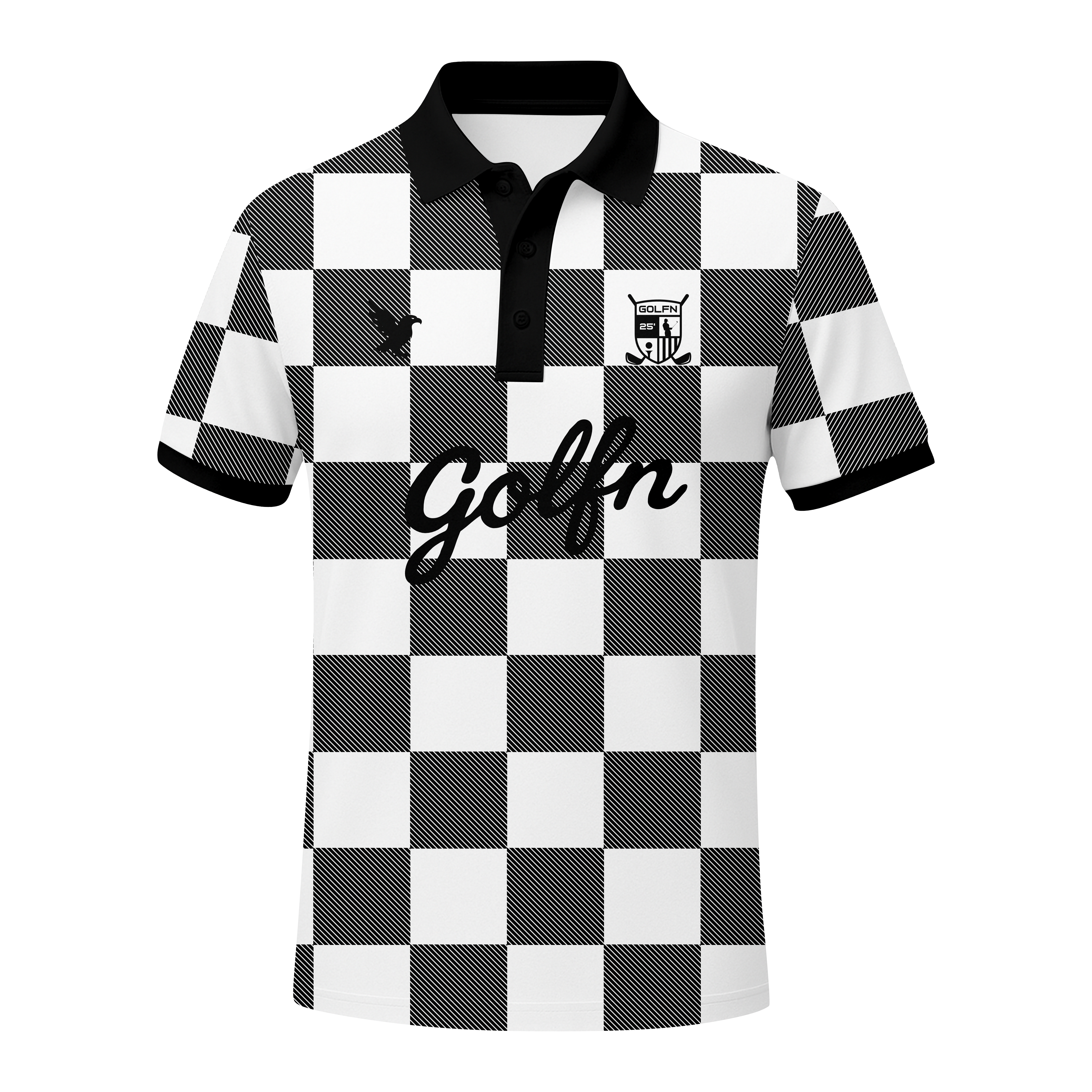 This lightweight jersey showcases a bold black-and-white checkered design that delivers a modern, standout look. Crafted for comfort and breathability, it features two premium silicone logos on the upper chest and a finely embroidered logo across the center for a high-quality finish. Completed with a black collar and sleeve cuffs, this jersey blends performance, style, and durability seamlessly.