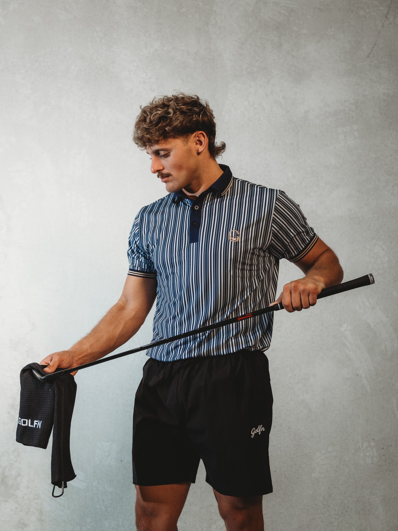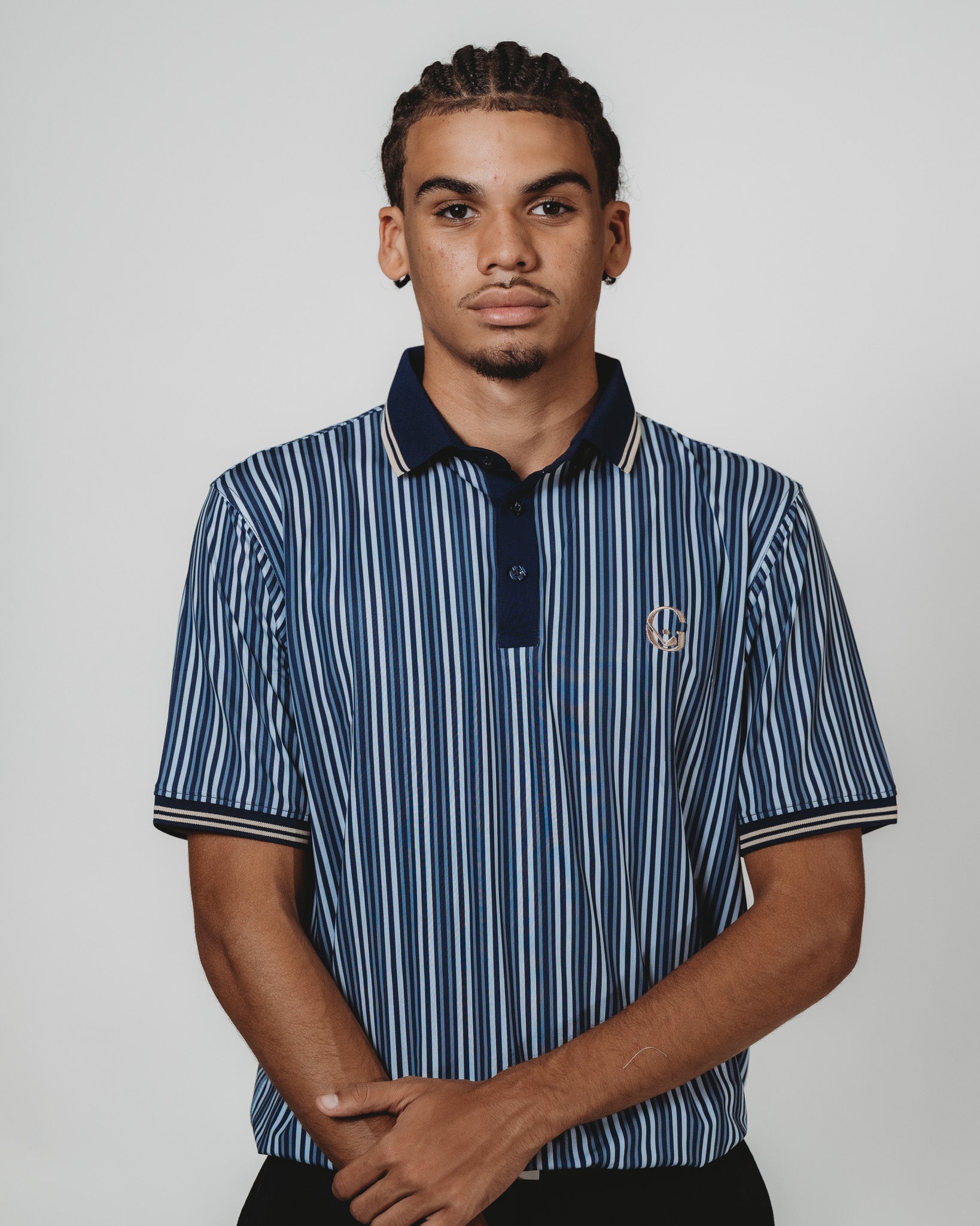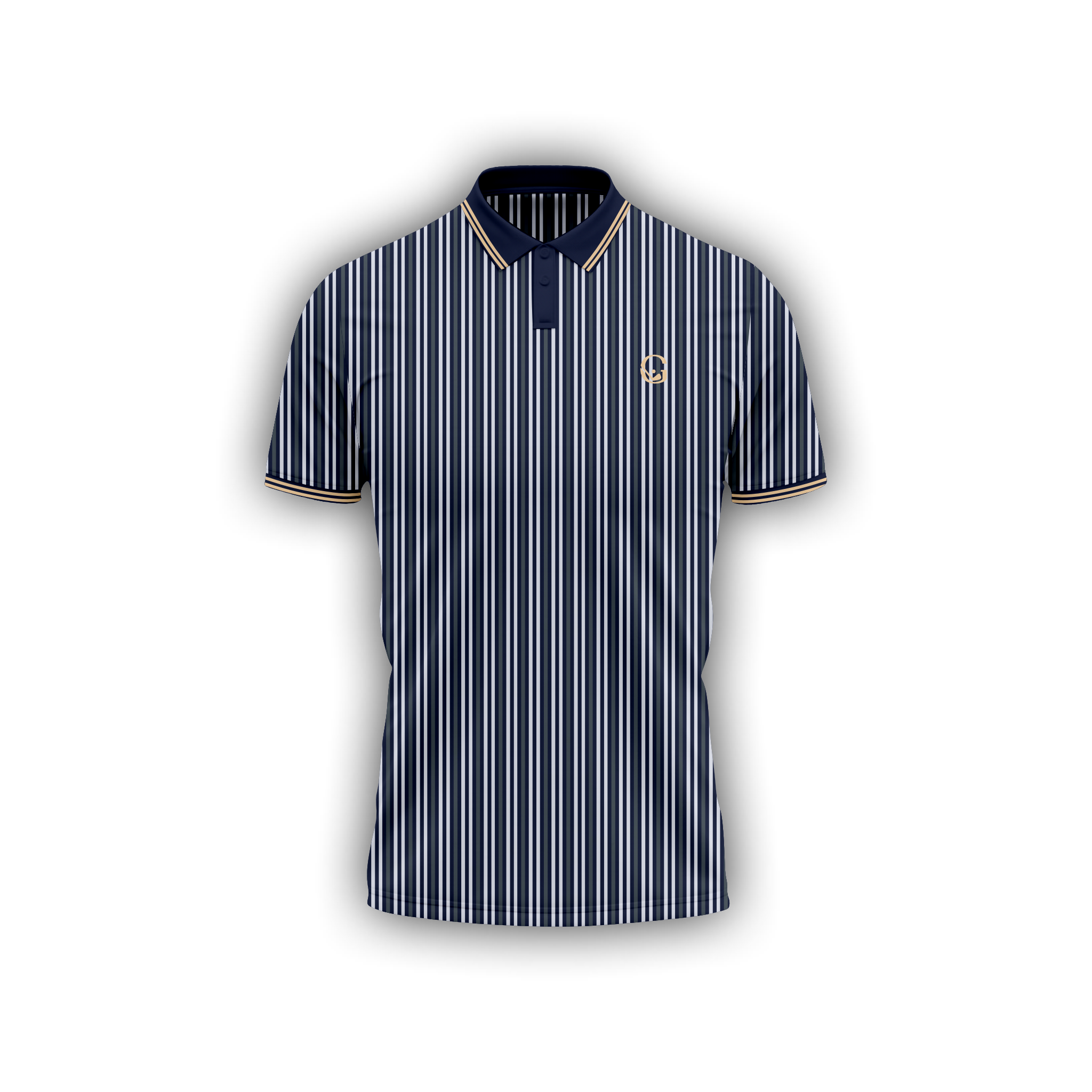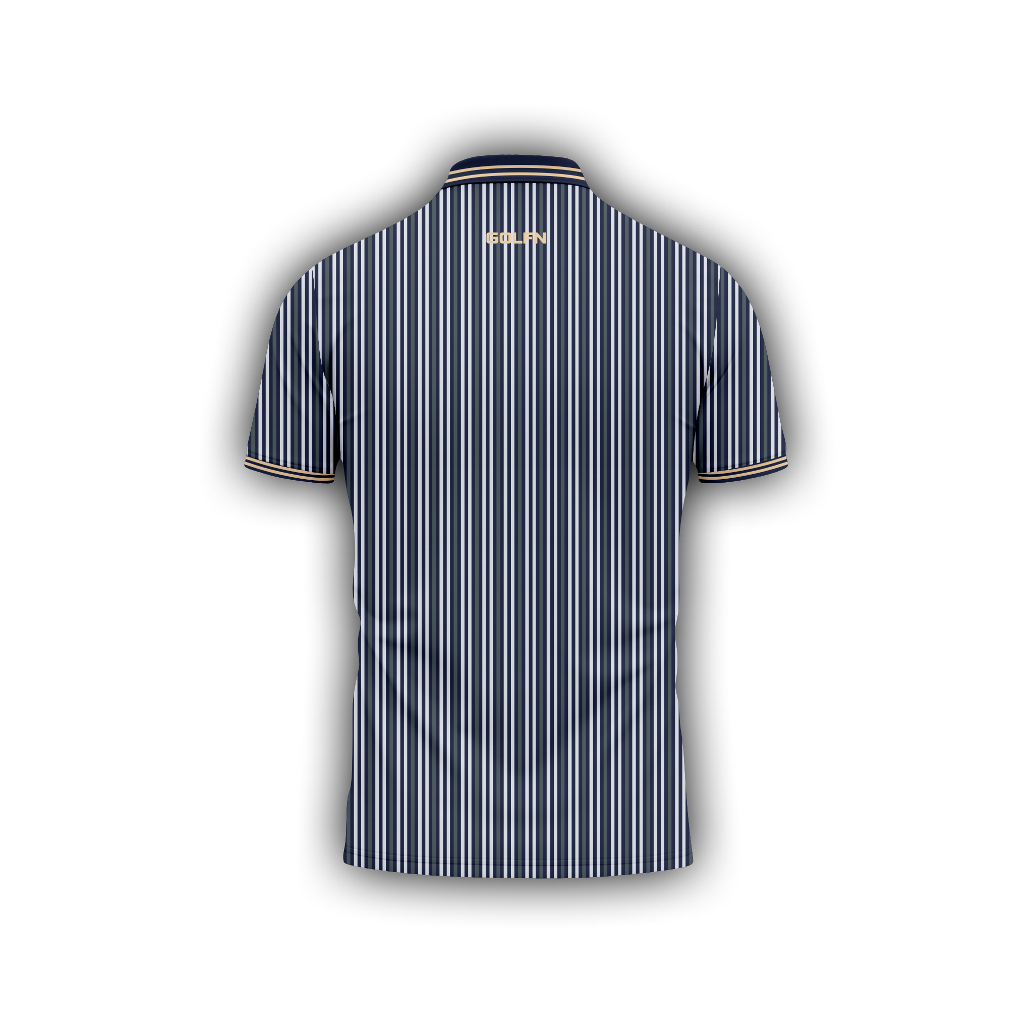 Clean, classic, and built to perform. The Ayer Performance Polo features a deep navy base with refined vertical striping and subtle gold detailing on the collar and sleeves with embroidered logos. Lightweight and breathable, it’s designed for a sharp look and all-day comfort