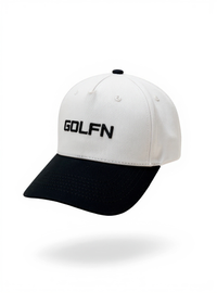 A sleek white Golf cap featuring raised peach embroidery for a modern, minimal look. Designed with structured panels and a curved brim, this cap delivers both comfort and style for everyday wear.